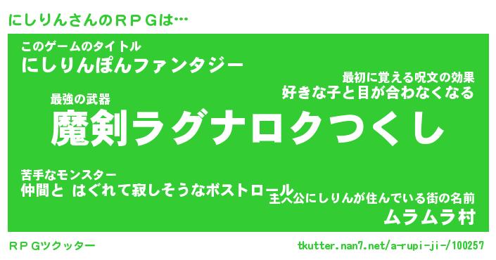 | 男性向けラノベタイトル風あだ名 | 『にしりんの憂鬱』 |