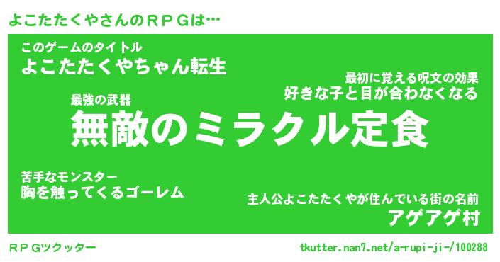 | 男性向けラノベタイトル風あだ名 | 『ヨコタタクヤアートオンライン』 |