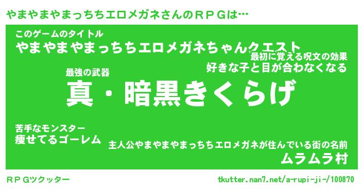 | 男性向けラノベタイトル風あだ名 | 『ヤマヤマヤマッチチエロメガネアートオンライン』 |