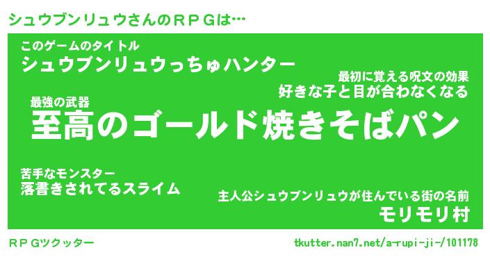 | 男性向けラノベタイトル風あだ名 | 『シュウブンリュウアートオンライン』 |