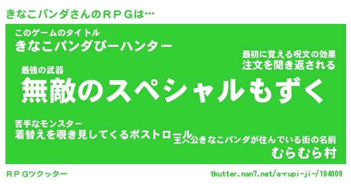 | 男性向けラノベタイトル風あだ名 | 『キナコパンダアートオンライン』 |