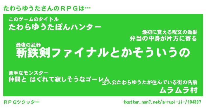 | ヒーロー風カッコイイあだ名 | 『スーパータワラユウタ』『銀牙騎士タワ』 |
