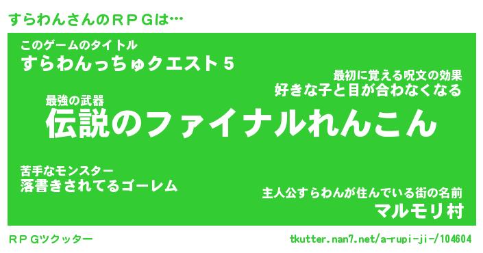 | 男性向けラノベタイトル風あだ名 | 『すらわんの憂鬱』 |