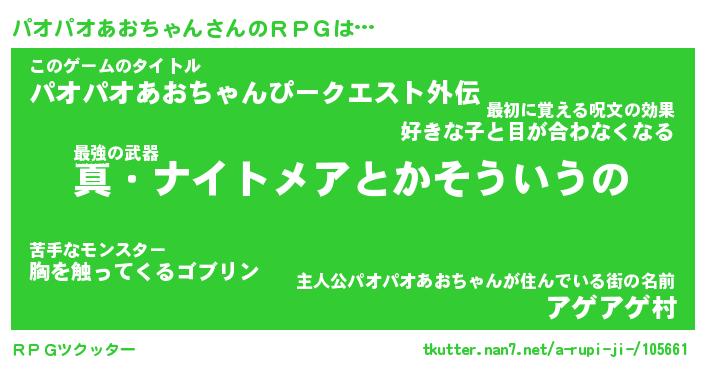 | 男性向けラノベタイトル風あだ名 | 『パオパオアオチャンアートオンライン』 |