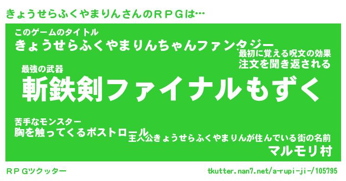 | 男性向けラノベタイトル風あだ名 | 『きょうせらふくやまりんの憂鬱』 |