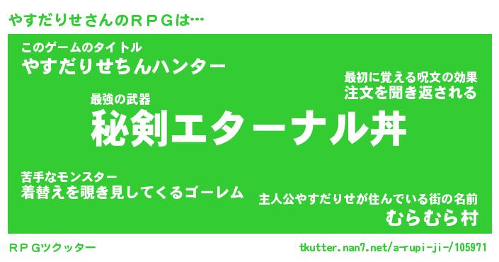 | 男性向けラノベタイトル風あだ名 | 『やすだりせの憂鬱』 |