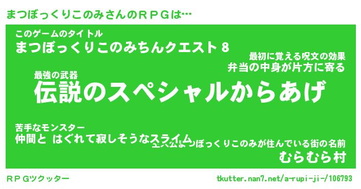 | 男性向けラノベタイトル風あだ名 | 『まつぼっくりこのみの憂鬱』 |