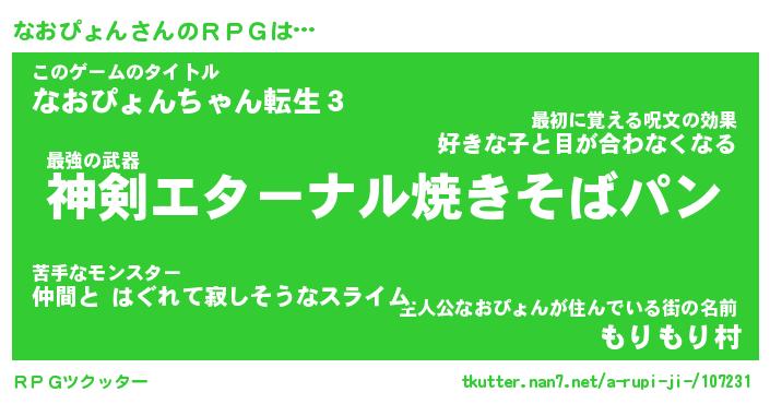 | 男性向けラノベタイトル風あだ名 | 『なおぴょんの憂鬱』 |