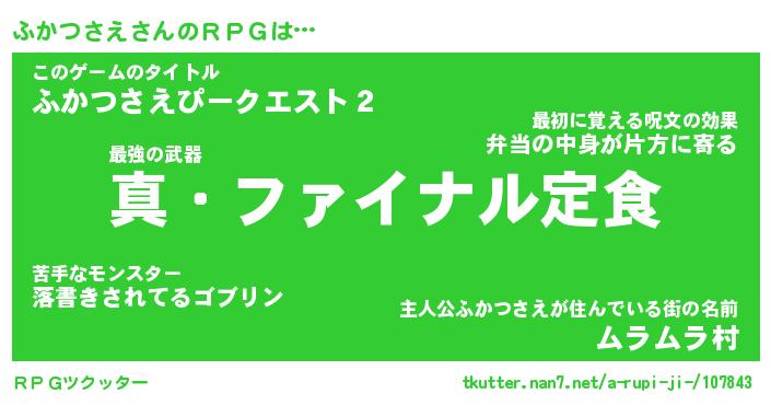 | 男性向けラノベタイトル風あだ名 | 『フカツサエアートオンライン』 |