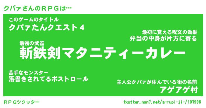 | 男性向けラノベタイトル風あだ名 | 『クパァの憂鬱』 |