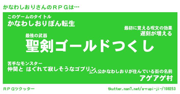 | 男性向けラノベタイトル風あだ名 | 『かなわしおりの憂鬱』 |
