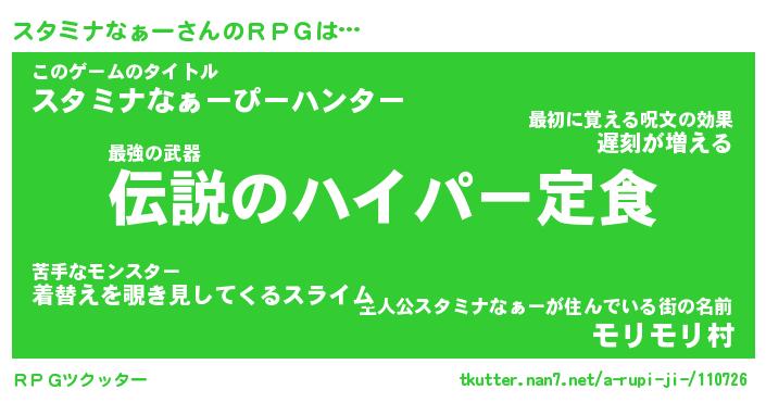 | 男性向けラノベタイトル風あだ名 | 『スタミナなぁーの憂鬱』 |