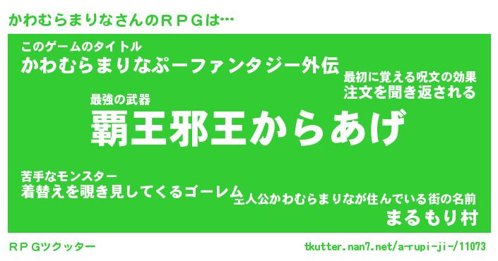 | 男性向けラノベタイトル風あだ名 | 『カワムラマリナアートオンライン』 |