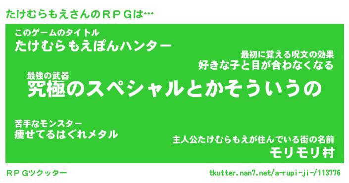 | ヒーロー風カッコイイあだ名 | 『スーパータケムラモエ』『魔戒騎士タケ』 |