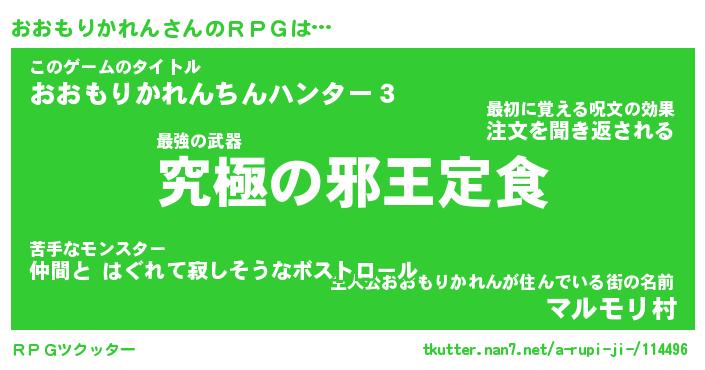 | 料理風あだ名 | 『節約★おおもりかれんと油揚げの玉子丼』 |
