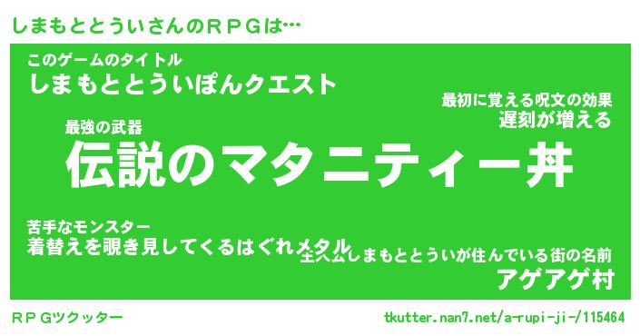 | 男性向けラノベタイトル風あだ名 | 『しまもととういの憂鬱』 |