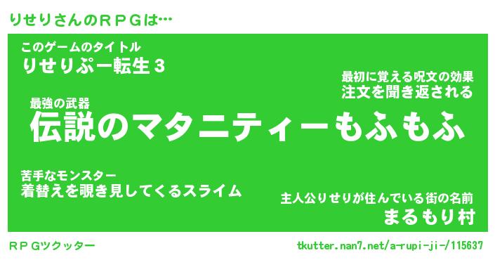 | 男性向けラノベタイトル風あだ名 | 『りせりの憂鬱』 |
