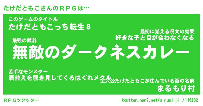 | ヒーロー風カッコイイあだ名 | 『スーパータケダトモコ』『魔戒騎士タケ』 |