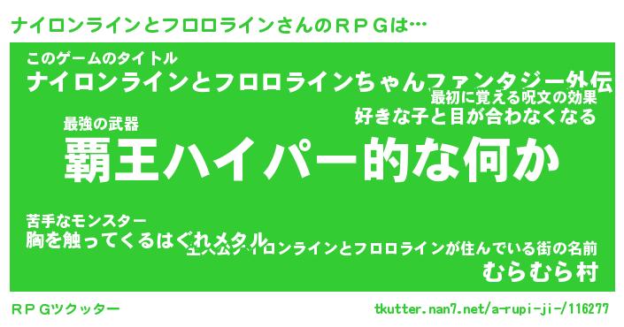 | 伝説のあだ名 | 『封印されし竜騎士ナイロンラインとフロロライン』 |