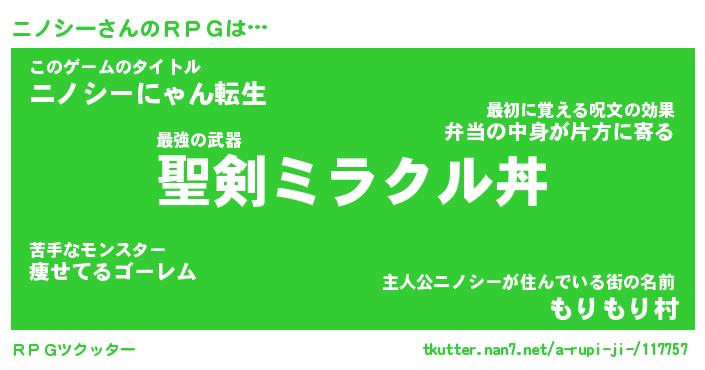 | 男性向けラノベタイトル風あだ名 | 『ニノシーの憂鬱』 |