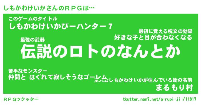 | 男性向けラノベタイトル風あだ名 | 『しもかわけいかの憂鬱』 |