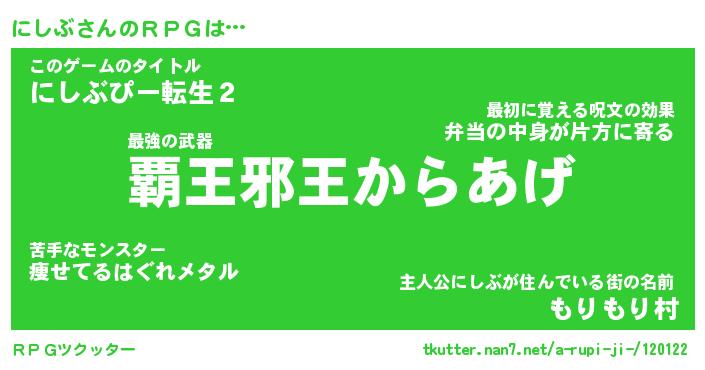 | 男性向けラノベタイトル風あだ名 | 『ニシブアートオンライン』 |