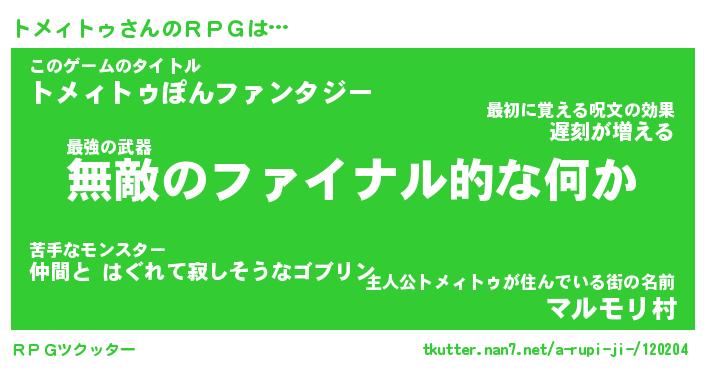 | 料理風あだ名 | 『節約★トメィトゥと油揚げの玉子丼』 |
