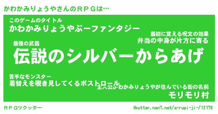 | 男性向けラノベタイトル風あだ名 | 『かわかみりょうやの憂鬱』 |