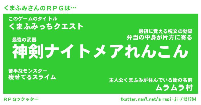 | 男性向けラノベタイトル風あだ名 | 『くまふみの憂鬱』 |