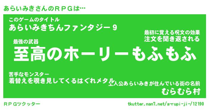 | ファンタジー風あだ名 | 『アラフェル』『エターナルアライミキー』 |