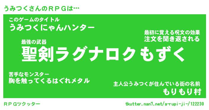 | 男性向けラノベタイトル風あだ名 | 『うみつくの憂鬱』 |