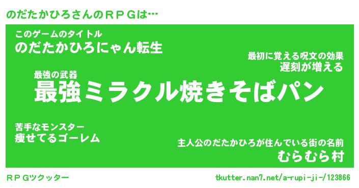 | 男性向けラノベタイトル風あだ名 | 『ノダタカヒロアートオンライン』 |