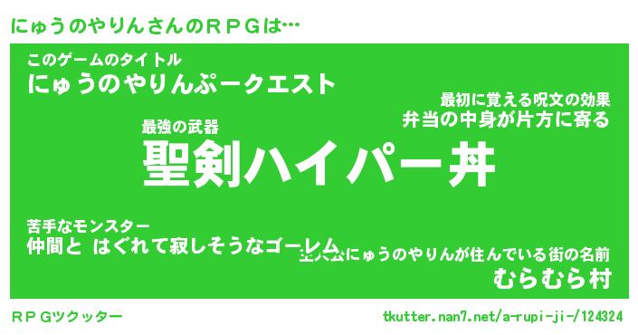 | 男性向けラノベタイトル風あだ名 | 『にゅうのやりんの憂鬱』 |