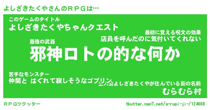 | 男性向けラノベタイトル風あだ名 | 『ヨシザキタクヤアートオンライン』 |