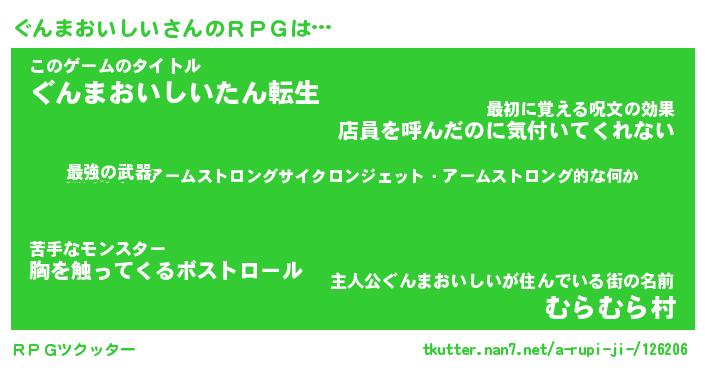 | 男性向けラノベタイトル風あだ名 | 『グンマオイシイアートオンライン』 |