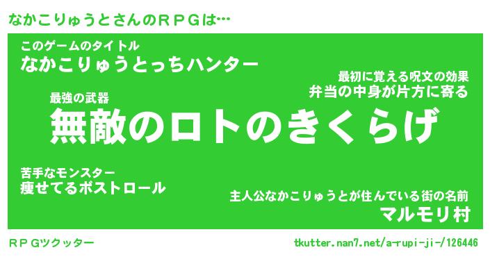 | 男性向けラノベタイトル風あだ名 | 『ナカコリュウトアートオンライン』 |