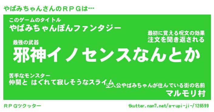| 男性向けラノベタイトル風あだ名 | 『ヤバミチャンアートオンライン』 |