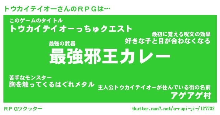 | 男性向けラノベタイトル風あだ名 | 『トウカイテイオーアートオンライン』 |