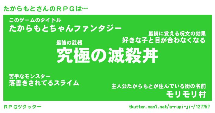 | 男性向けラノベタイトル風あだ名 | 『たからもとの憂鬱』 |