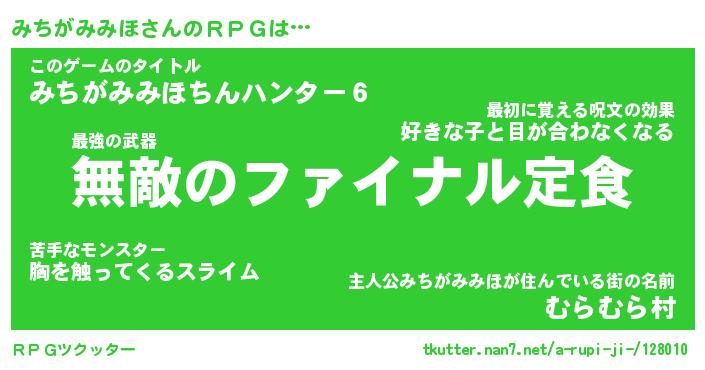 | 男性向けラノベタイトル風あだ名 | 『ミチガミミホアートオンライン』 |