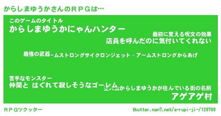 | 男性向けラノベタイトル風あだ名 | 『カラシマユウカアートオンライン』 |