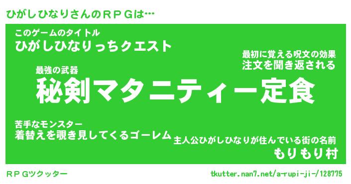 | 男性向けラノベタイトル風あだ名 | 『ひがしひなりの憂鬱』 |