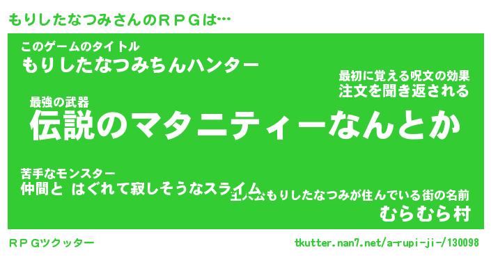 | 男性向けラノベタイトル風あだ名 | 『もりしたなつみの憂鬱』 |