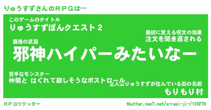| 男性向けラノベタイトル風あだ名 | 『リュウスズアートオンライン』 |