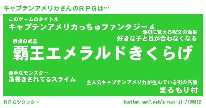 | 男性向けラノベタイトル風あだ名 | 『キャプテンアメリカアートオンライン』 |