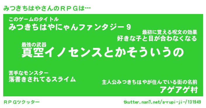 | 男性向けラノベタイトル風あだ名 | 『ミツキチハヤアートオンライン』 |