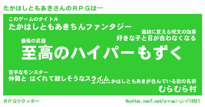 | 男性向けラノベタイトル風あだ名 | 『タカハシトモアキアートオンライン』 |