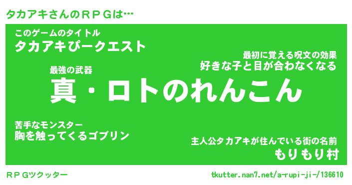 | 男性向けラノベタイトル風あだ名 | 『タカアキアートオンライン』 |