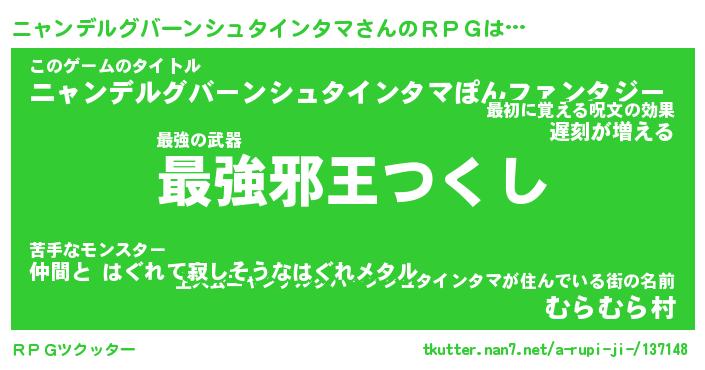 | 男性向けラノベタイトル風あだ名 | 『ニャンデルグバーンシュタインタマアートオンライン』 |