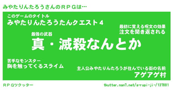 | 男性向けラノベタイトル風あだ名 | 『ミヤタリンタロウアートオンライン』 |